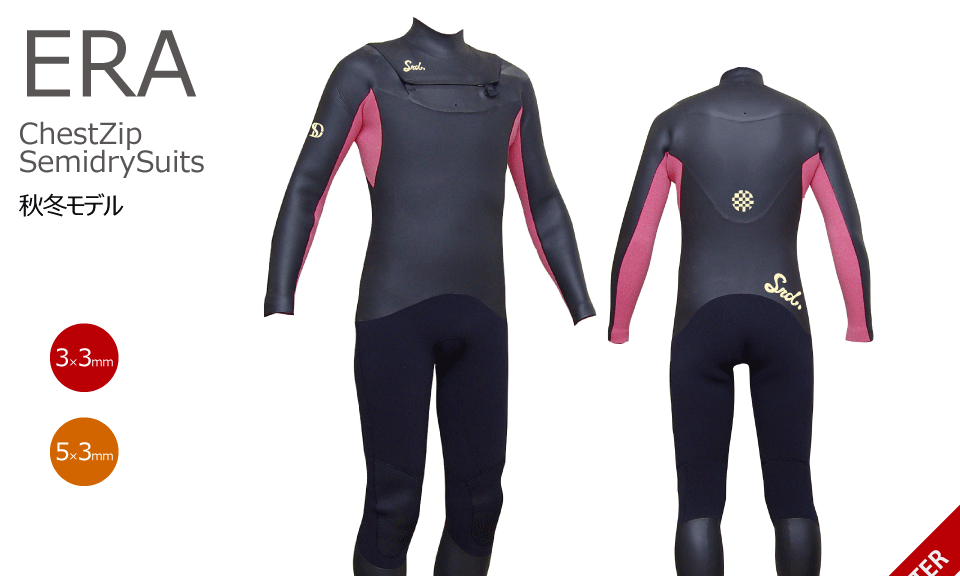 進化したチェストジップモデル「ERA」。非常に大きく開く開口部でどんな方にも着脱が容易に行えます。インナーとアウター二重のエリで浸水は極めて少なく、また浸水があった場合にも冷たい水が体に触れることなく排出されるようドレンホール(排出穴)用いた設計となっています。袖口は水の侵入を防ぐリブ巻き仕様、裾は着脱が容易に行えフィット感抜群のキリッパナシ仕様、裏面にシリコンテープを備えてずり上がりやめくれるのを軽減しています。セミドライスーツのベース素材にはこの冬最高の保温性を誇る起毛素材エアフレイムブースト[AFB]、最高の速乾性を持ちリサイクル糸を編み込んだエコ素材ドライマックスR「DMR」、抜群の軽さと価格を抑えたフレンドリーな起毛生地カール「CRL」から選択可能です。